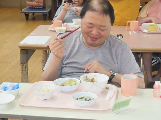 この実演料理は利用者の皆さんに日頃から食べる楽しみを持っていただく行事食のひとつとなっています。