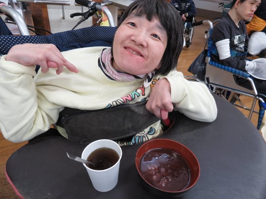 〈つきたてのお餅とコーヒーを前に満面の笑みです〉 〈1番人気はぜんざいです♪〉